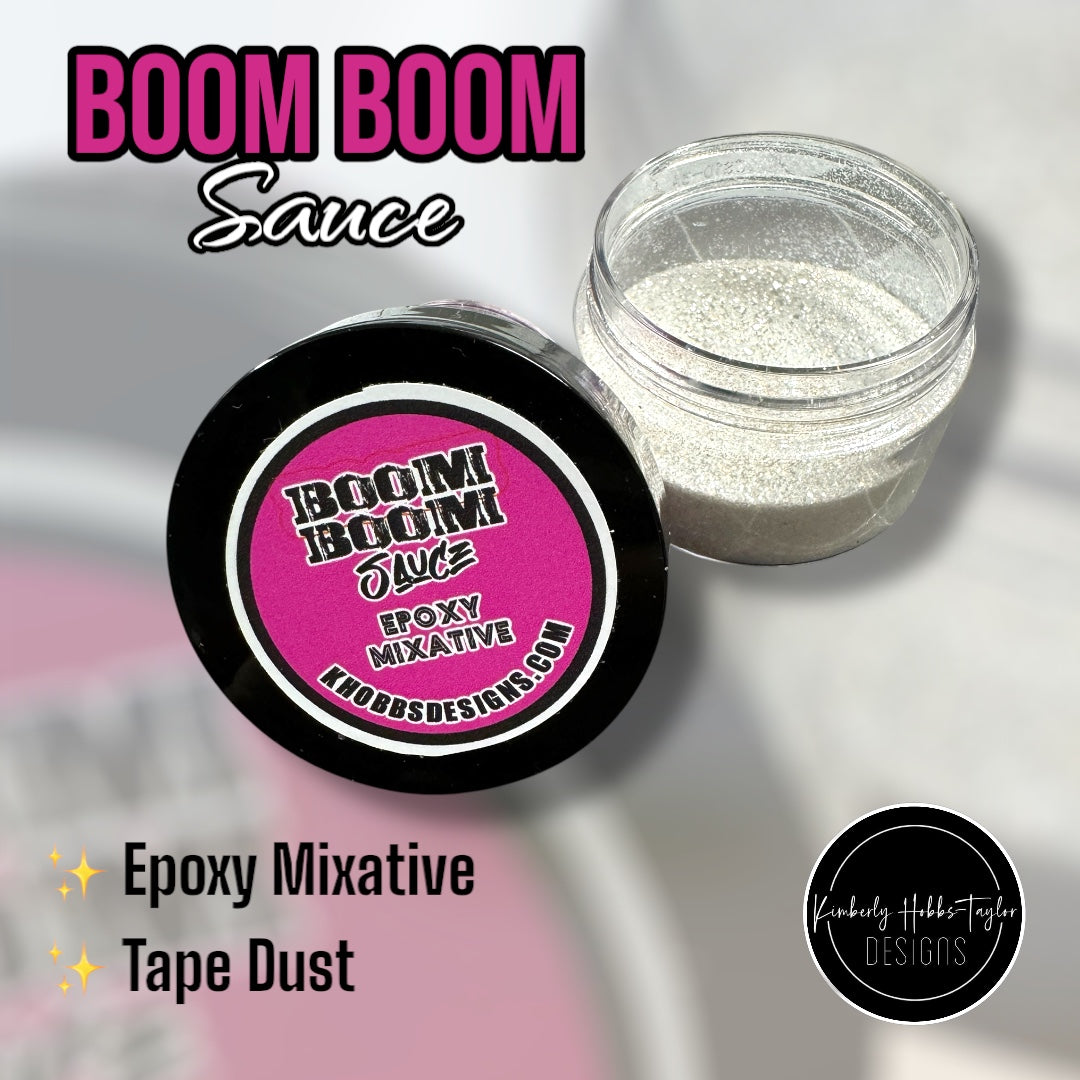 Listing is for one (1) 2oz jar of BOOM BOOM Sauce, by volume. BOOM BOOM Sauce is an epoxy mixative, formulated by Kimberly Hobbs-Taylor, that can be added to any epoxy layer, for that extra BOOM of sparkle! It can also be used over double-sided adhesive tape, to create a shimmery, translucent effect, perfect for adding a decal over patterned vinyl. A little goes a long way, so one jar will last for many projects.