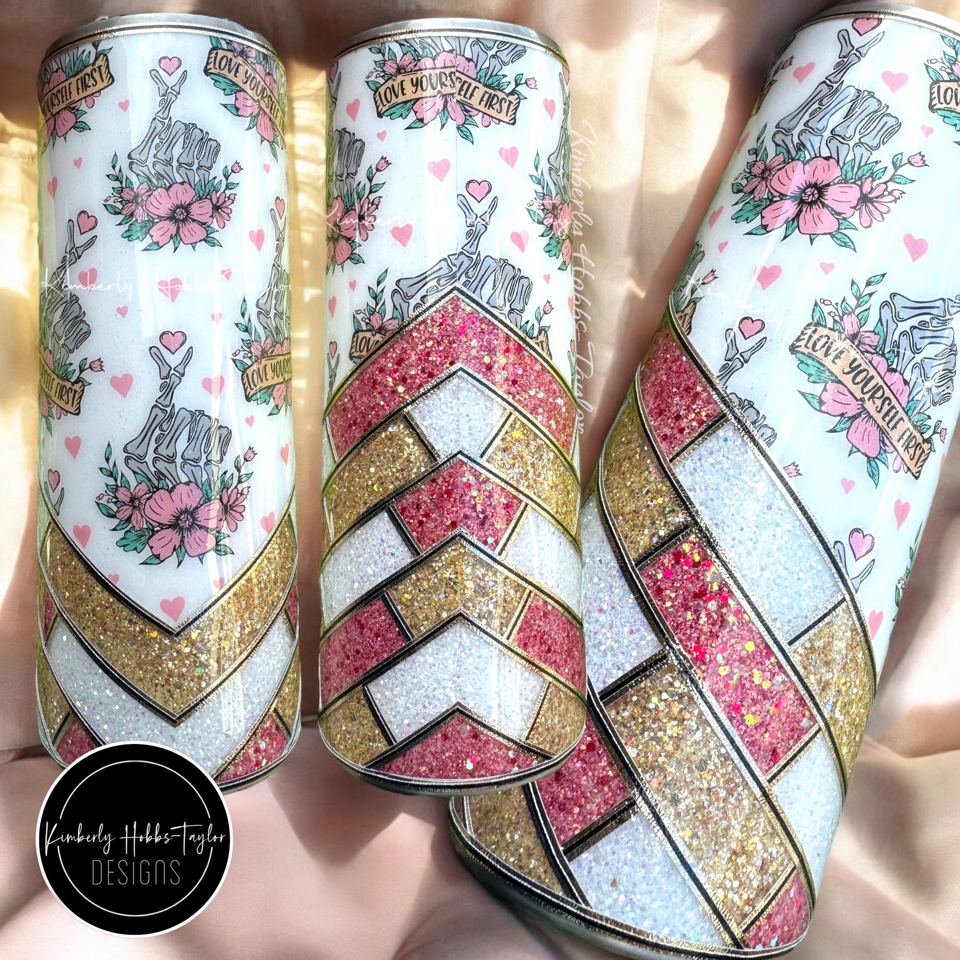 24oz Love Yourself Tumbler. Embellished with vinyl and high quality glitter, striped out with gold and black textured vinyl. Holds 24oz under the lid. Comes with straw.