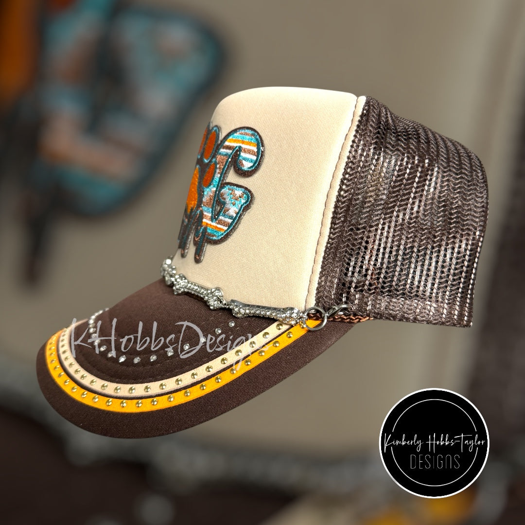 Expertly crafted in my design studio in Texas, this handcrafted beauty is a One Size Fits Most with an adjustable back closure. Notable features include embroidered focal patch, rhinestone-encrusted bone shaped hat chain, studded trim, and a variety of rhinestones in different sizes.